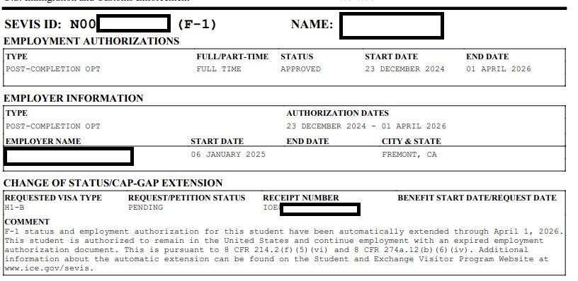- Your I-20 will also include a special notation in the CHANGE OF STATUS/CAP-GAP EXTENSION section on page 2, showing details about your H-1B and H-1B receipt number and Comments.