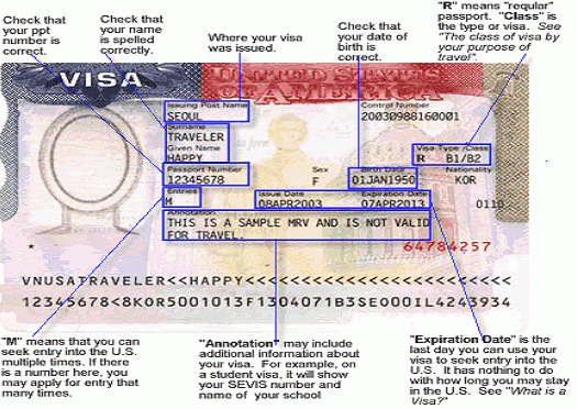 People come to the United States for many different reasons. The type of visa you request should match the purpose for your visit. Visa types are classified using an alpha-numeric system. For example, a visitor coming to study in the United States may be given an “F-1” or “J-1” student visa classification. A person coming to the United States for travel may be given a “B-2” visa, otherwise known as a tourist visa. The sample below shows what a tourist visa looks like: