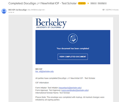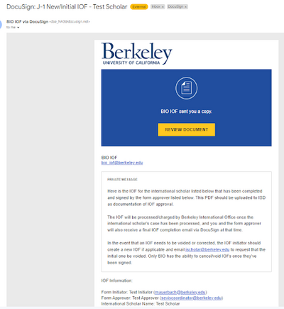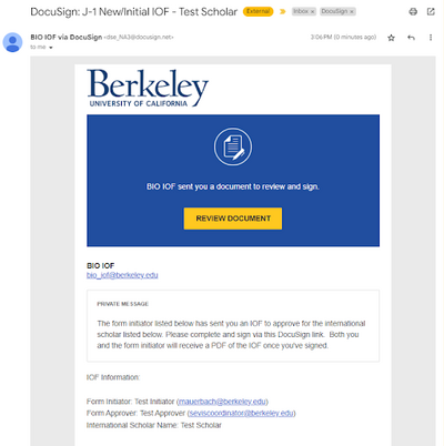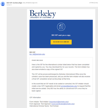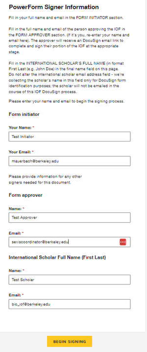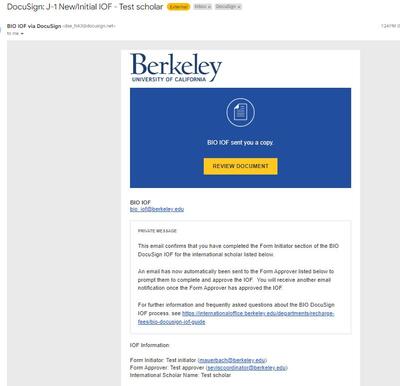 Note: do not alter the (placeholder) email field for the International Scholar/Employee - leave it as the pre-filled bio_iof@berkeley.edu. We’re collecting the international scholar/employee’s name in this field only for DocuSign form identification purposes; the international scholar/employee will not be emailed in the course of this DocuSign IOF process. -