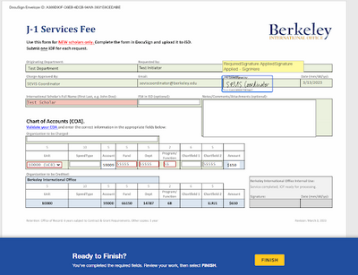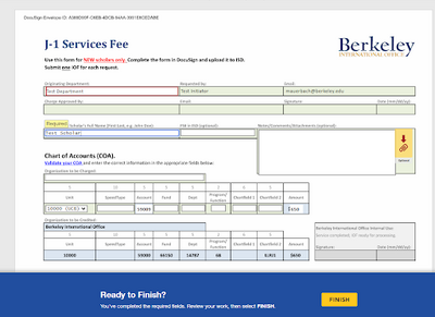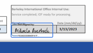 BIO staff will sign the “Berkeley International Office Internal Use” section of the IOF once the case has been processed to mark the IOF as ready to be charged to the department. The Form Initiator and Form Approver will receive a final email notification once this has been done.